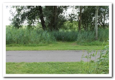 Je loopt door een hoek van het natuurgebied en je passeert het fietspad dat van en op de dijk gaat.