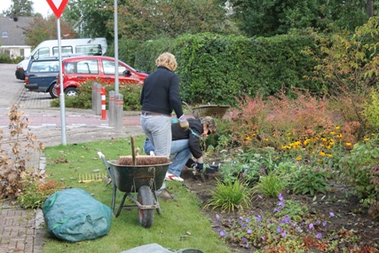 Het grote grasveld bestaat ook uit drie grote borders van diverse planten, struiken en bloemen die wij vrijwilligers iedere maand onder handen nemen door te schoffelen,vervangen van planten indien nodig of zo als de foto laat zien dat enkele bewoners zelfs bloemen en vaste planten aanbrengen aan de rand van deze borders.Dat geeft een diversiteit en een vrolijke aanblik.