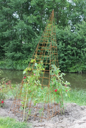 Oorspronkelijke stonden hier rode rozen. In de loop der jaren verwaarloosd. Na het groot onderhoud verzocht Wil om de rozenborder in oude staat terug te halen. Aangevuld met nieuwe rozen is dat in 2012 gebeurd. In 2013 zijn twee rozen piramides geplaatst. Gemaakt door Willem.