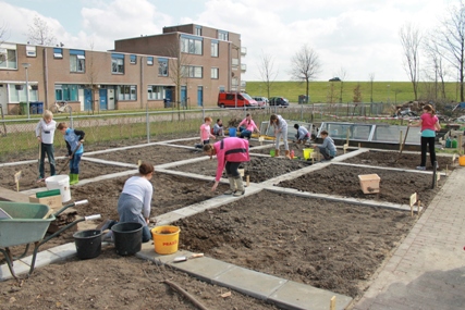 Als eerste de Boomgaard.Het beplanten van de 1e boom.