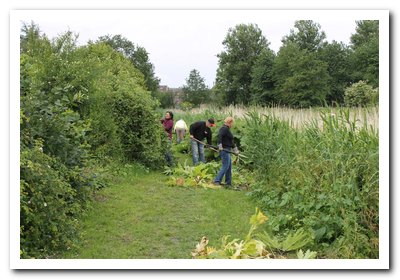 Langs de kwelsloot wordt jaarlijks gevochten. Een gevecht dat al een tien jaar gaande is. Het gaat om de strijd tegen de reuze berenklauw. Een import schermbloemige. Een gigant die zo een drie meter hoog kan worden. Een oerplant die nauwelijks te bestrijden is. Overal in het land wordt geprobeerd de opmars te stuiten. In het vroege voorjaar zijn de jonge bladeren nog goed te schoffelen. Maar verlies je de planten even uit het oog dan moet je de strijd aan tegen de metershoge bladeren. Sommigen reageren  hyper allergisch tegen het sap van de plant dat vrijkomt als je stengels doorsnijdt of je huid langs de bladeren strijken. Zware brandwonden kunnen het gevolg zijn. Een belangrijke reden om ze te bestrijden.Jaarlijks proberen wij er voor te zorgen dat de planten niet in bloei komen zodat de verspreiding stopt.