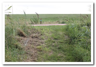 Je loopt door de relatief droge hoek van het natuurgebied en je loopt naar het fietspad dat van en op de dijk gaat.