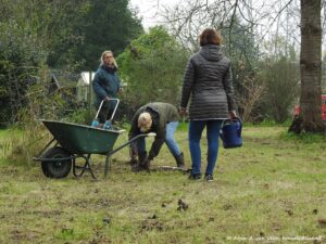 Het planten in het krachtbos verloopt voorspoedig. De struiken zitten al in de grond voordat Arjen arriveert. Wel is hij op tijd voor het planten van de bomen. Twee juwelen ; een judasboom en een paulownia. CC viel bijkans van haar stokkie toen ze die bomen van de week mocht ontvangen.