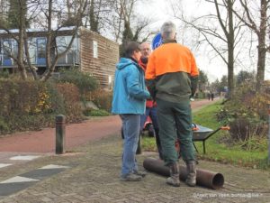 Centraal staat vandaag een boom. Ton rolt een stalen buis naar de startplek.