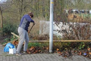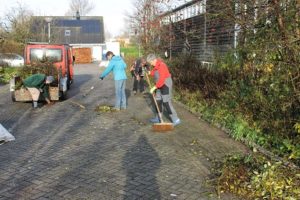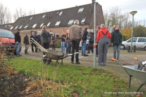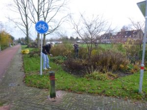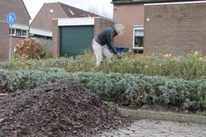 Anton en Nike schonen de rozenborder. Na de pauze haal ik met Nike een bakkie snippers op van het schoolplein van de Aquamarijn. Nike verwerkt de snippers tussen de rozen. Een lekker dekentje voor de winter en een onkruidremmer in het komende jaar.
