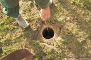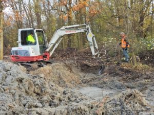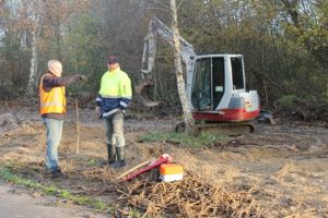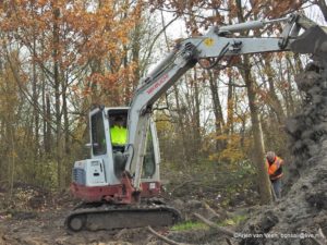 Als grondwerker volgt hij Jan die vandaag een eerste contour van de kwelwadi realiseert. Een kuub rietwortels wordt vrijgemaakt en met bijeengeharkt gemaaid riet en gras op een hoop gezet . Susan, Regien, Jos en Johan mopperen dat dit toch een belachelijk zware klus is en niet leuk vanwege de hondenpoep. Voor een volgende keer bedanken zij alvast. Wel is een ieder trots op het nieuwe landschap dat Jan en Thom in de loop van de dag uit de grond boetseren.