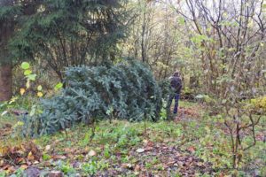 Na de pauze volgt het omzagen, het bijzondere transport door het windbos en het herplanten van de boom. Tja, hoe krijg je dat ding het bos uit.