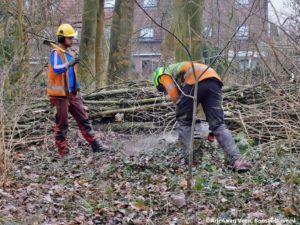 De takken van de gewezen buurt essen gelegen naast het KWAM  zijn weggehaald en ter plaatse gehakseld.