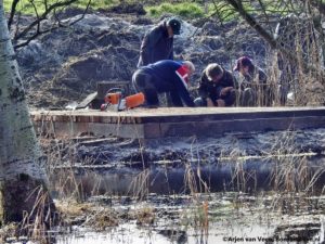 Dit seizoen stond volledig in het teken van de essen tak ziekte. Gelaafd en gesterkt zagen Regien en ik de laatste balken voor de vloer van de kijkhut. Zodoende kan morgen de montageploeg verder. Hans zet een nieuw plaatje op Greets vogelhut.