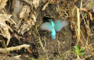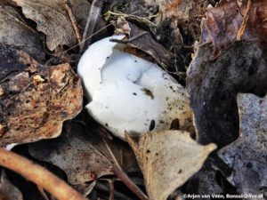 Nanette heeft een bijzonder waarneming in het vogelbos. “ Met nog een paar warme uren te gaan en het laatste beetje Histor voor de finishing touch van de deuren aan de boskant, hoor ik de lente de grond uit stampen. Heerlijk om in de prille natuur mijn huis te verven. De energie in de middag is voelbaar anders dan de ochtenduren. Voetstappen van een onbekende zoekend door ramen van een aantal buren, bewegen door dorre bladeren. Enigszins afgeleid maar met de focus op het laatste beetje verfwerk, verdwijnt de wandelaar, scholier/student achter de boom, waar hij gelijktijdig met de laatste uitgekiende verfstrijken niet meer tevoorschijn lijkt te komen.Nieuwsgierig geworden naar zijn bewegingen vliegt de pot met zijdezachte glans in een onbewaakt moment als een salto door de lucht ondersteboven op de berg zand, als stroop, nu als structuurverf.Ik staak het werk en beweeg me naar de andere kant van de boom, waar ik oog in oog sta met zijn groot geschut genietend in de lentestralen. Ik vraag of hij dat niet thuis kan doen, waarop hij beleefd antwoord dat hij er thuis niet in kan. De lente, ieder zo zijn eigen vliegende start.”
