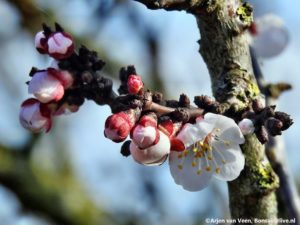 En hij ziet het begin van de bloei van de abrikoos.