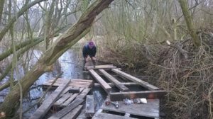 Regien, Mike, Bram en Rob zijn actief bij “de plek. De balken van de vloer worden gemonteerd en een plankier wordt vastgezet. Er wordt een watermonster gesignaleerd.