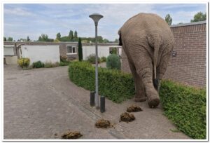 José schrok zich rot. Er waren vannacht twee olifanten op het grote grasveld gesignaleerd. Ze kon nog net op tijd foto’s maken. Eén daarvan schoof de heg aan de woning van Johanna geheel opzij en daarbij moest hij zo nodig ook nog de straat vol schijten.