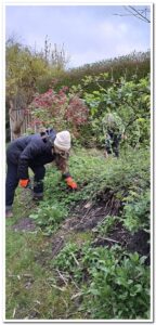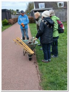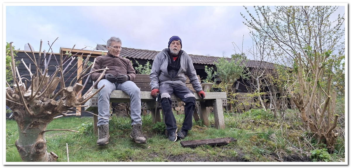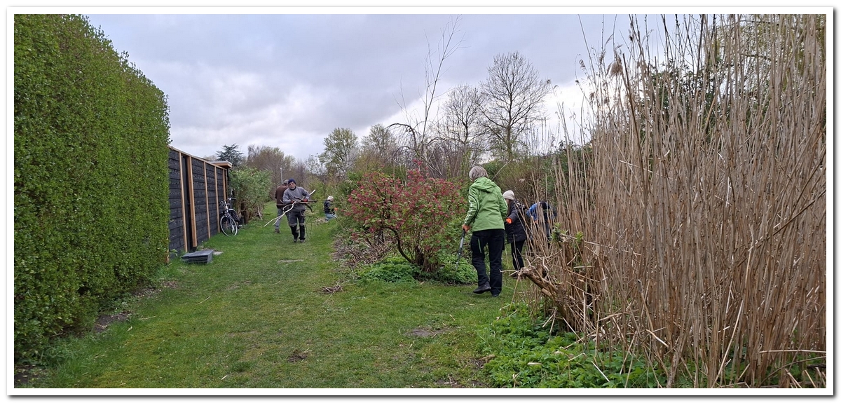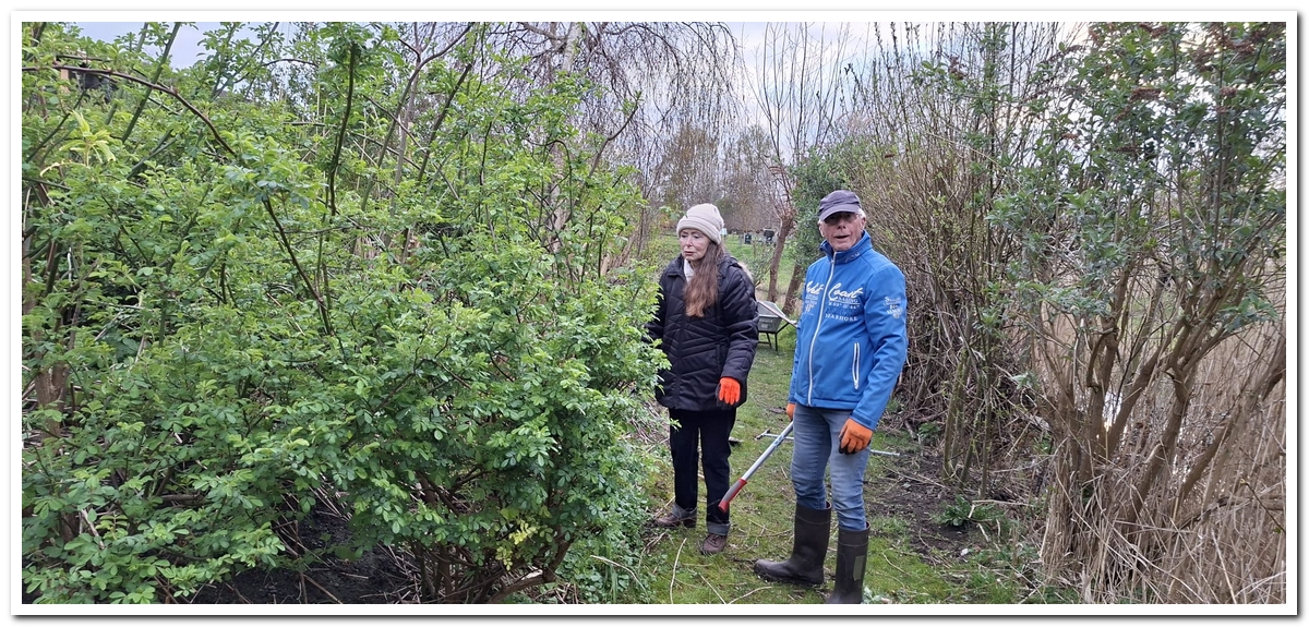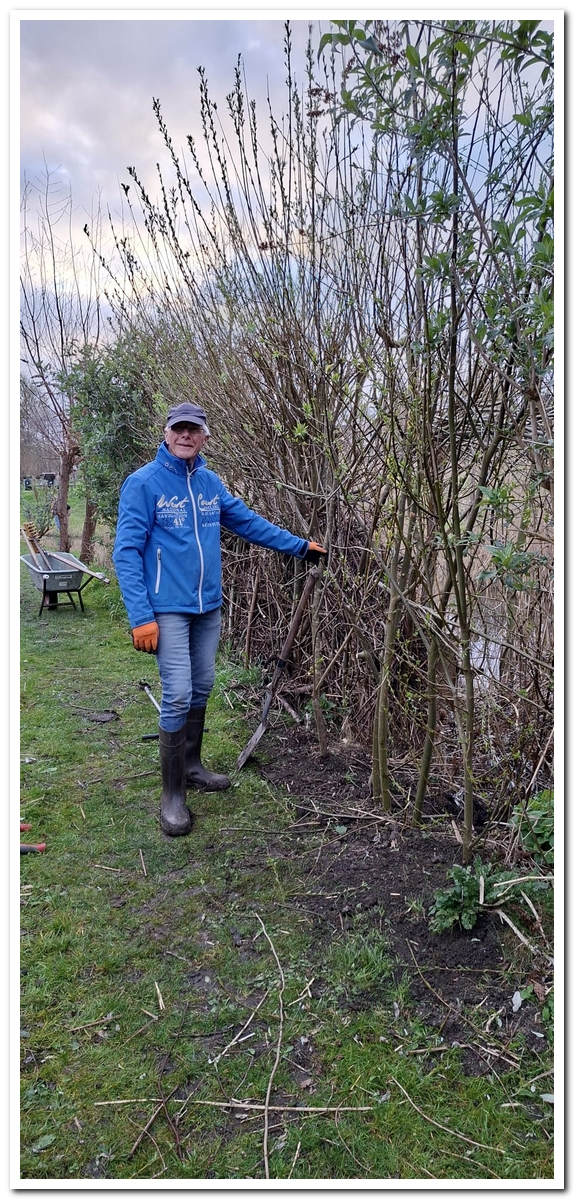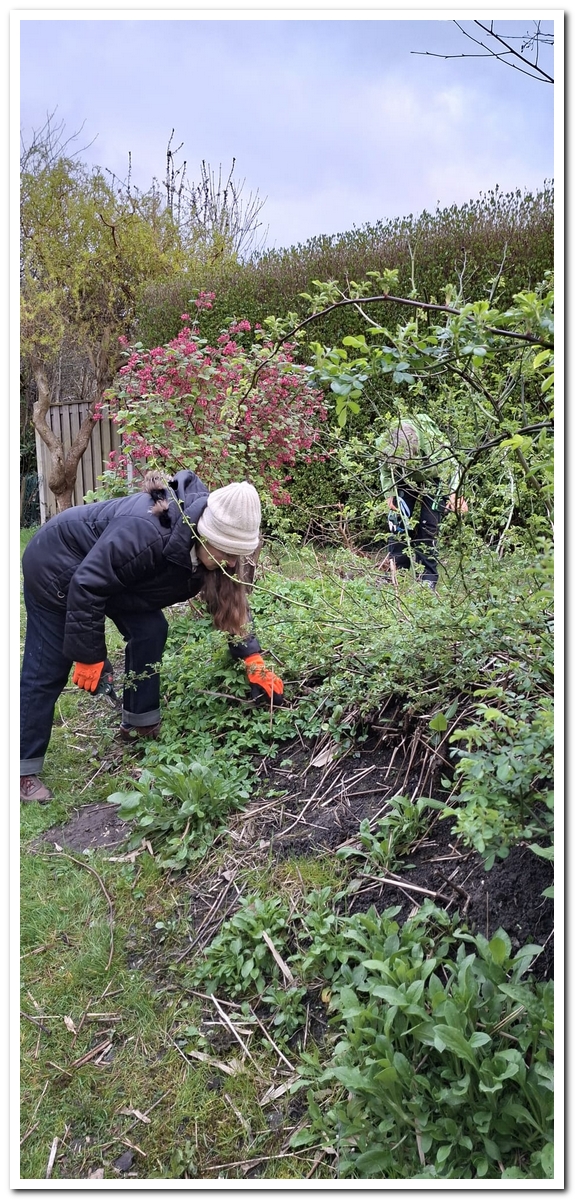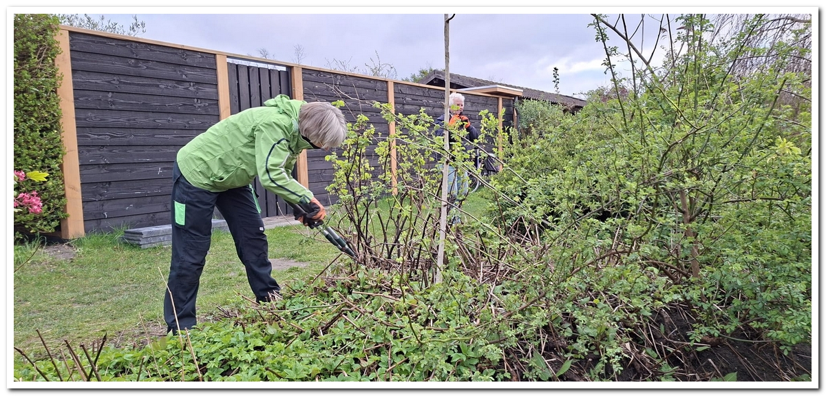 Marlies, Hester en Yvonne snoeien, Ad graaft gaten, waarvoor , geen idee.