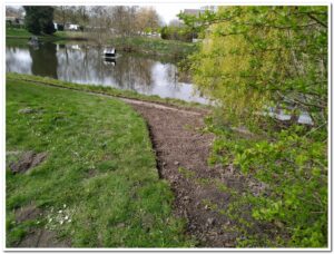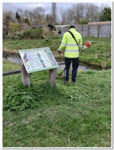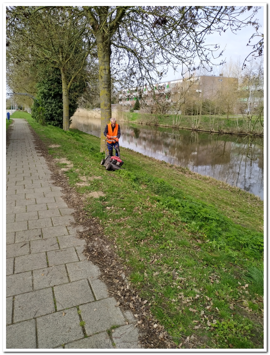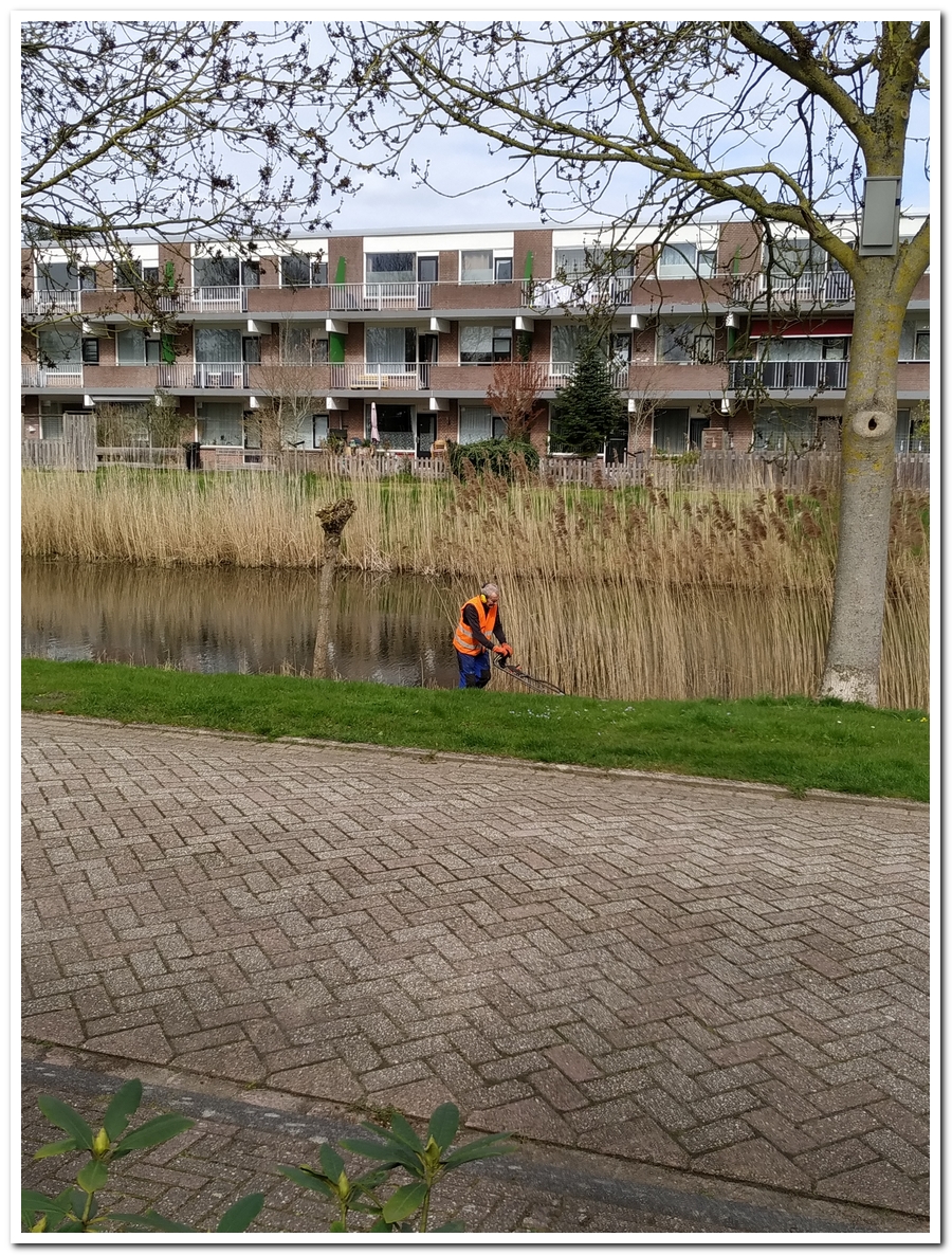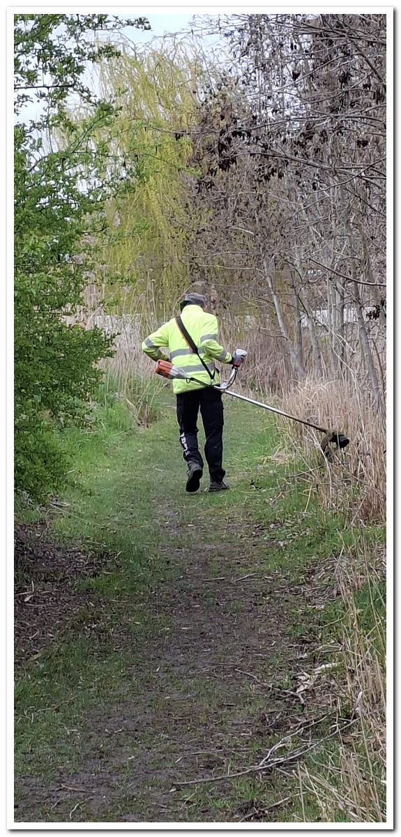 Ook bij de maaiploeg hoort het gras maaien aan het talud maar dan met de handmaaier door Thom.