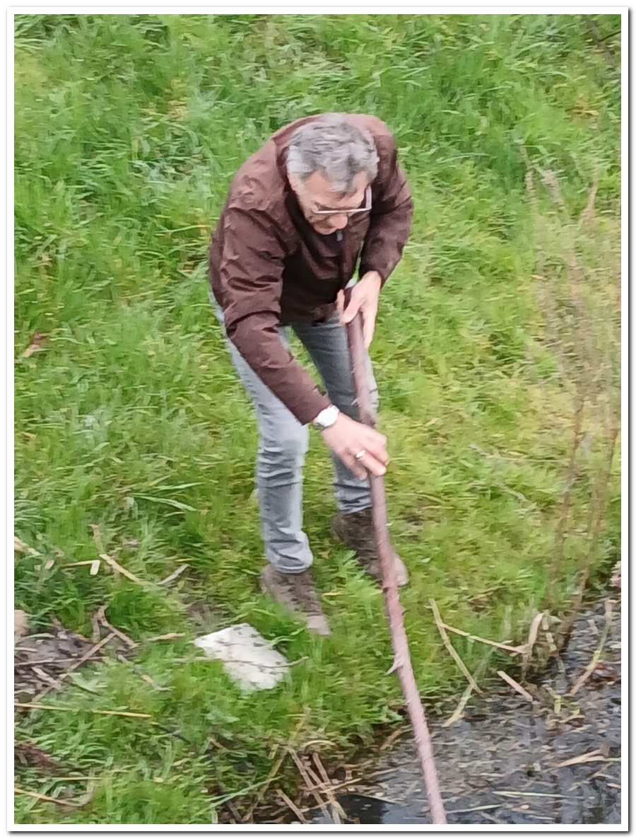 Ook Bram hoort bij de maaiploeg. Die is hier bezig om een nieuwe draad te wikkelen voor zijn bosmaaier. Om daarna om de palen en bomen het hoge gras te maaien.
