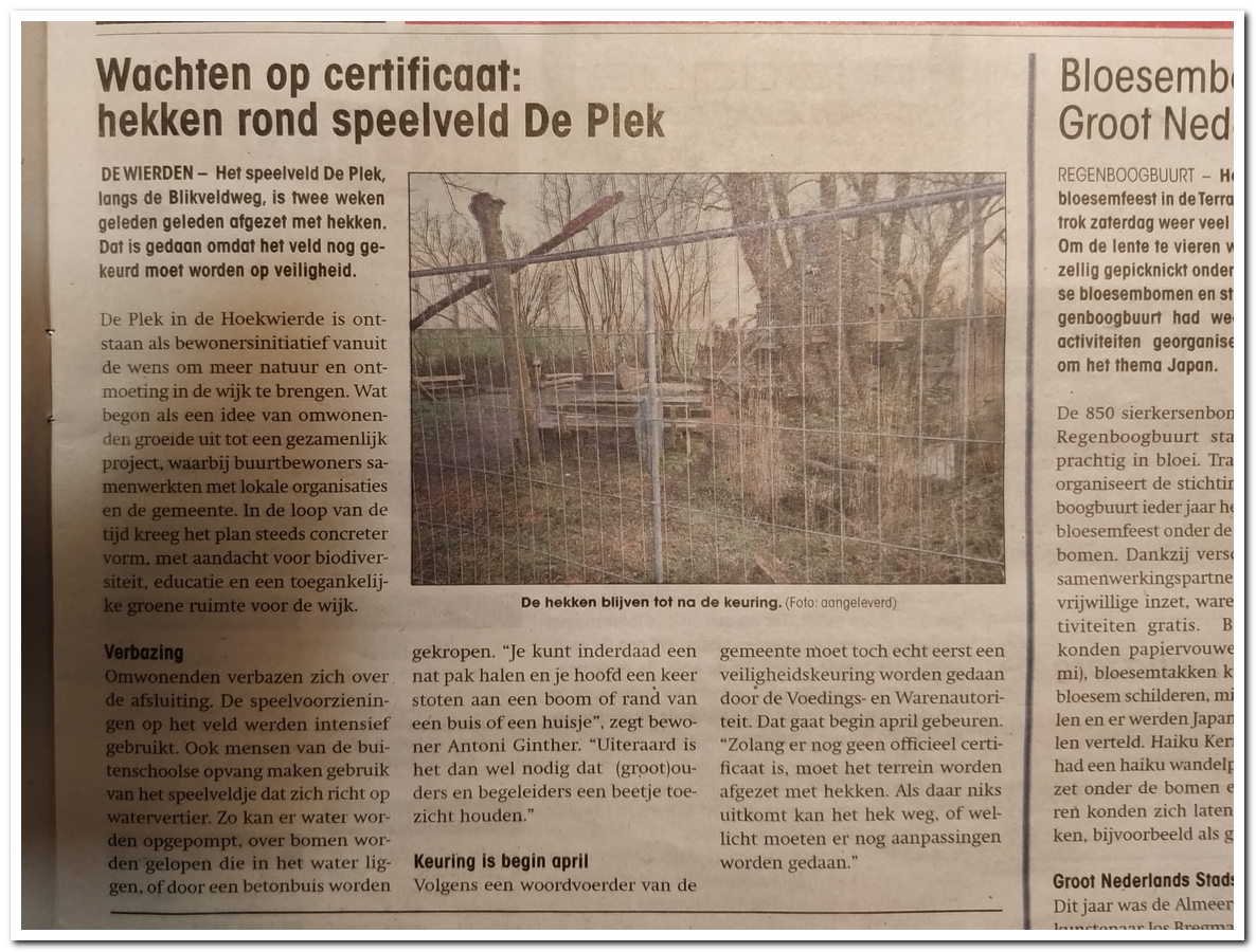 Het is waarschijnlijk wel bekend, maar in het laatste “Almere deze week” krantje werd nog een keer uitgelegd waarom de speelplek gekeurd zal moeten worden door de gemeente op veiligheid.