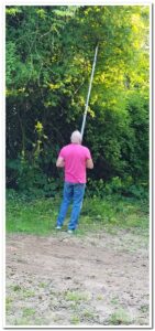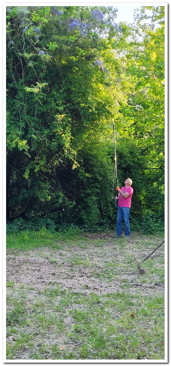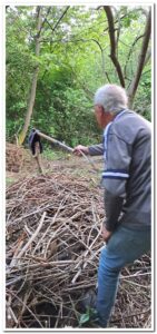 Hieronder is Jos bezig in het krachtbossie om het hoge gras te lijf te gaan met de bosmaaier.