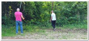 Stokken plaatsen rondom nieuwe aanplant langs de Kwelbeek. Het gras groeit nu zo snel dat er risico is dat plantjes, struikjes omver gebosmaaid worden.