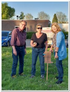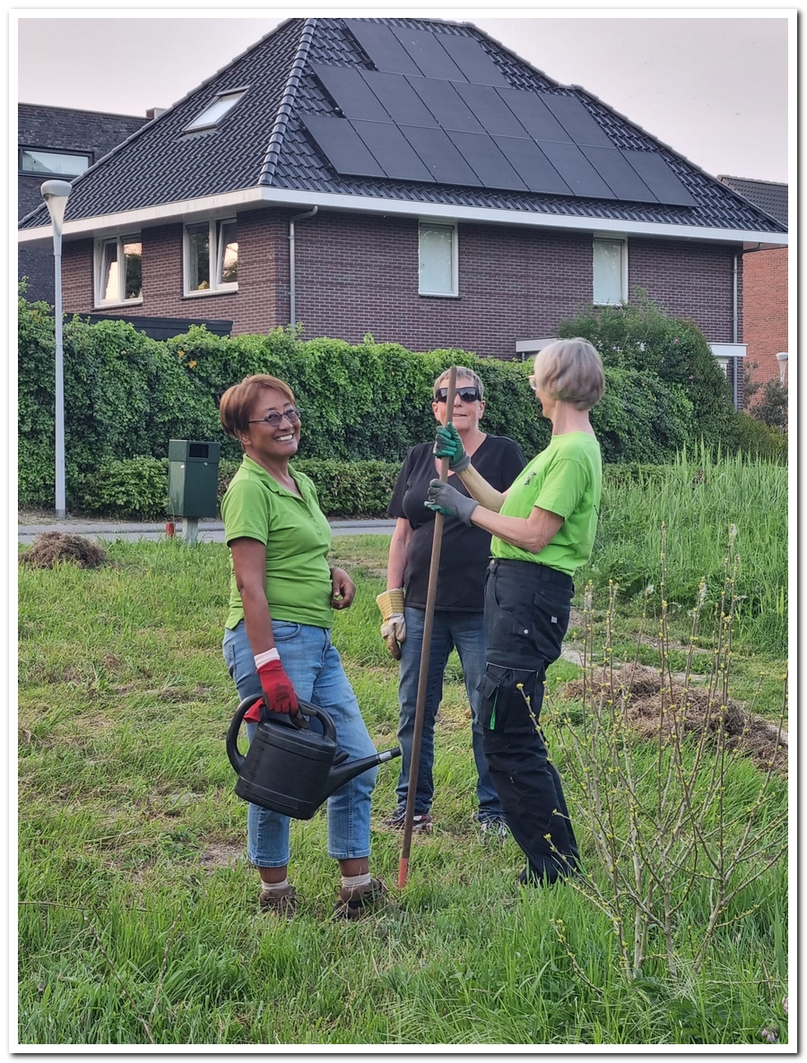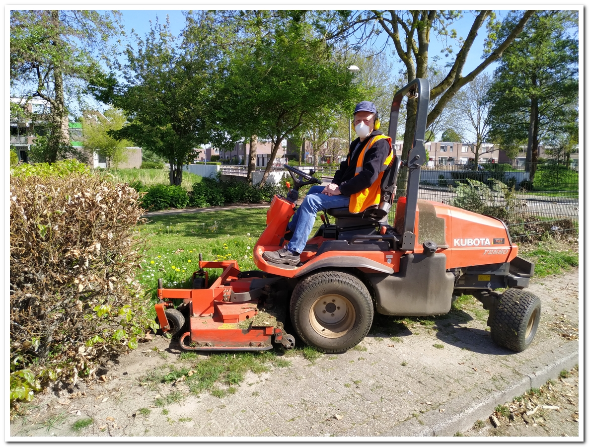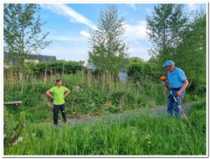 Oók voor de eerste keer dit seizoen is het onderhoud van de heggen in de wijk. Zo hier te zien door Bart en Corinne. Het knippen en schoffelen van de heggen aan beide zijden van het fietspad. Vooral de onderkanten van de heggen hebben zij het onkruidvrij geschoffeld.