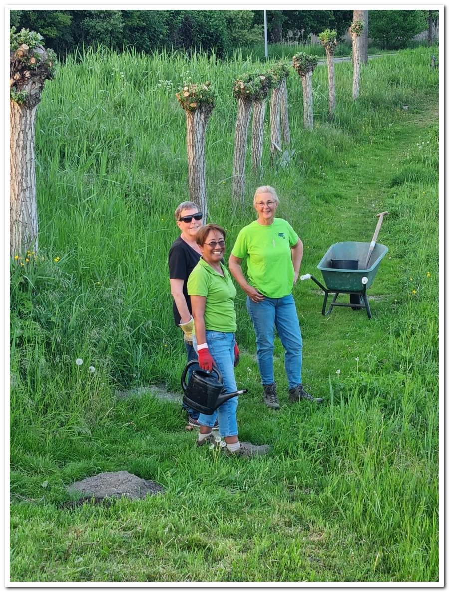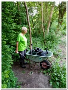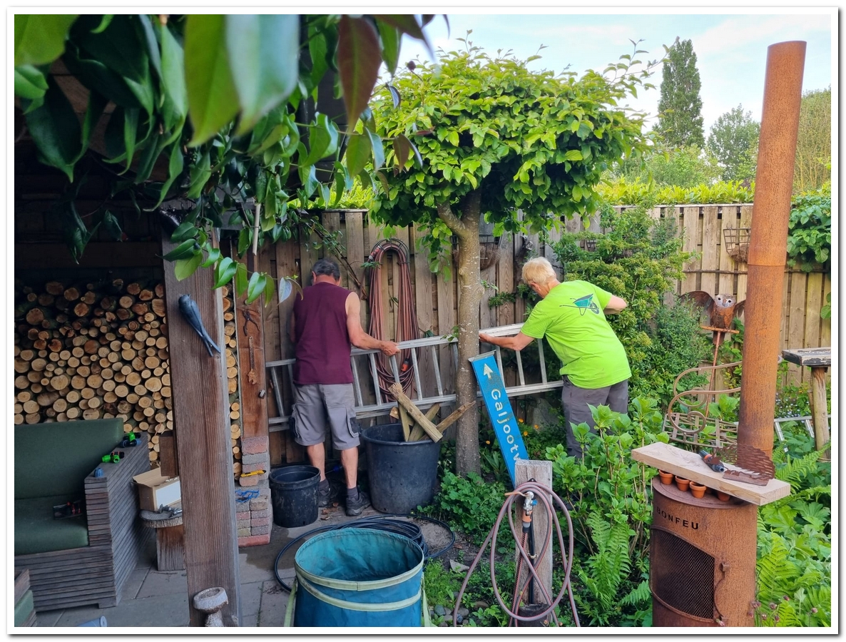 Op de 1ste foto staat Greet met een kruiwagen vol met gieters en de 2e Marlies. Samen hebben wij o.a. de lariksen water gegeven.