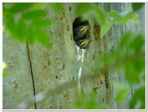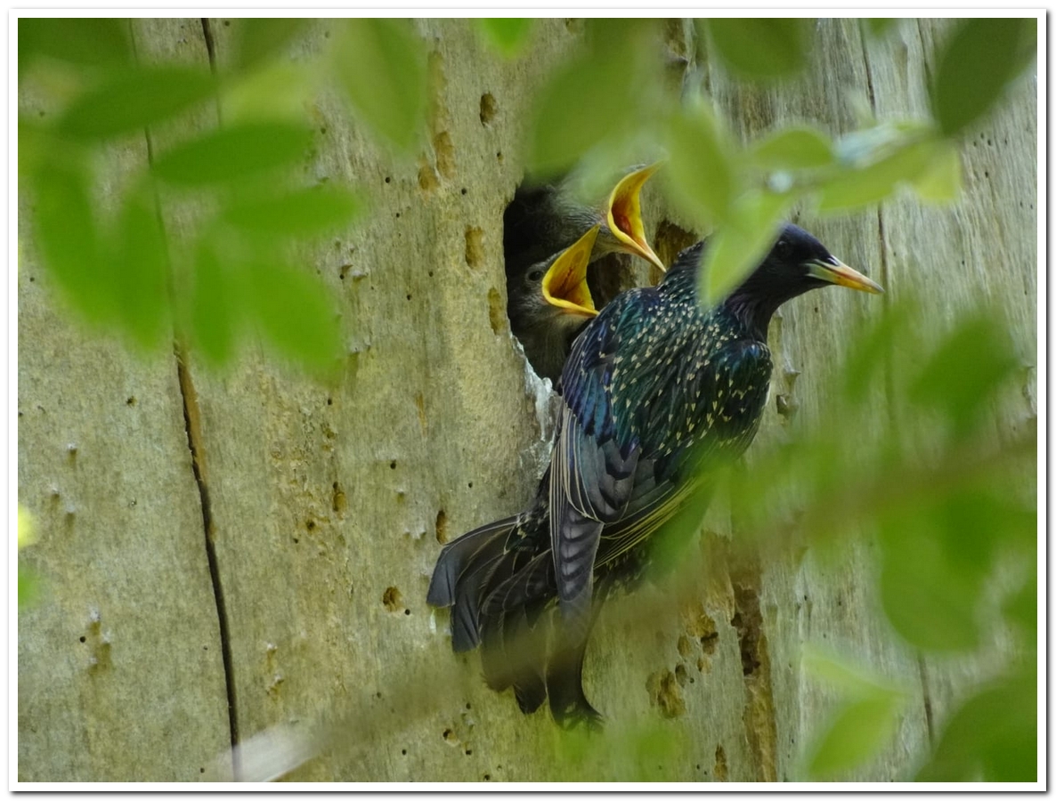 2 jonge spreeuwen in een spechtenhol in Krachtbossie wachten op eten.