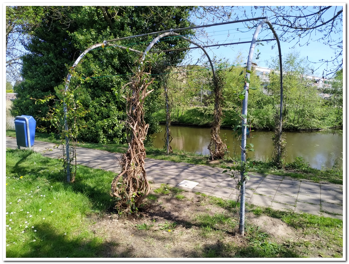 De wilde kamperfoelie op de zuidpoort naar Krachtbossie is goed aangeslagen, laat de nachtvlinders in het donker maar lekker op de sterke geur van de bloemen afkomen. Maar voor de bloei nog even geduld.