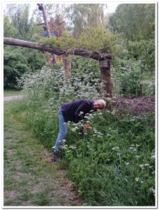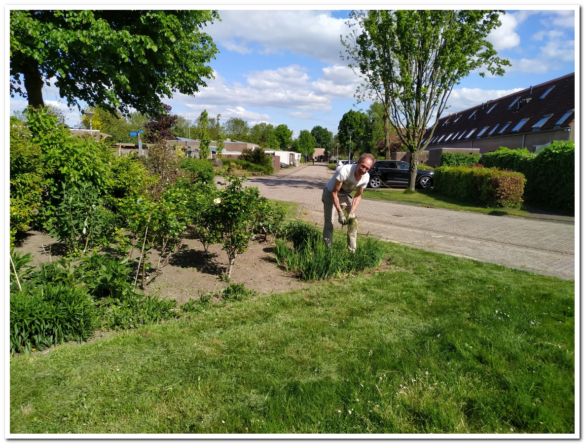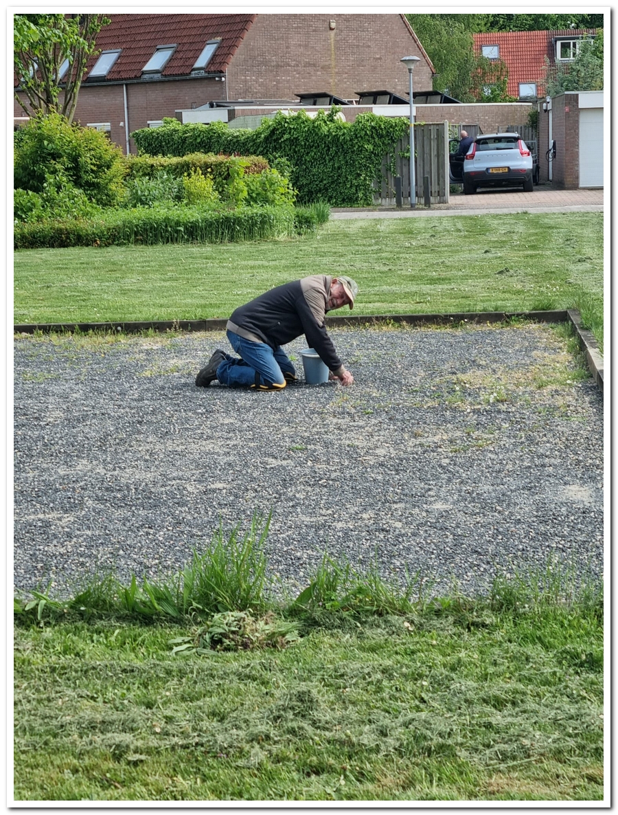 Tijdens dat ik bezig was met het verwijderen van het onkruid in de Jeu de Boulesbaan kwam Peter even langs waar ik een foto van hem nam.