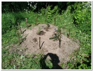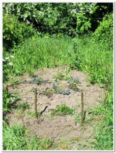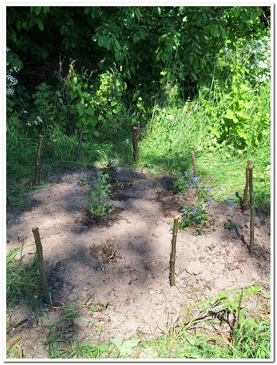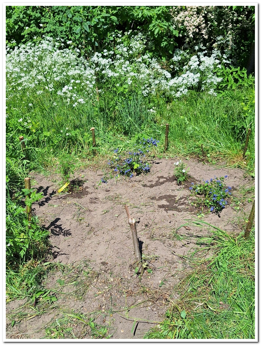 Even verderop in de vlinderstrook werd op drie plaatsen het onkruid uitgegraven rond diverse soorten nieuwe plantjes.