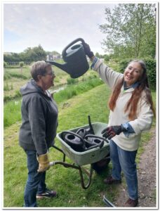 Daar komt Marrie aangelopen met een volle gieter met water om de nieuwe planten op de drie ronde plekken water te geven.