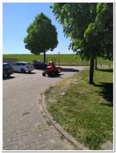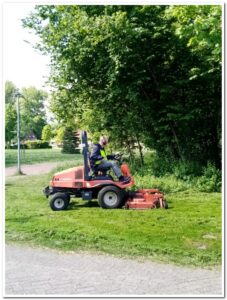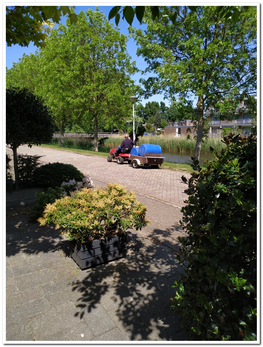 De nieuwe Hanging Basket plantjes zijn er weer. Maar eerst zag ik nog net Kees op de maaier voor zijn deel wat gemaaid moet worden.
