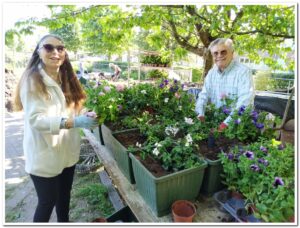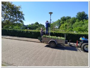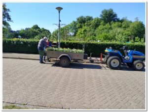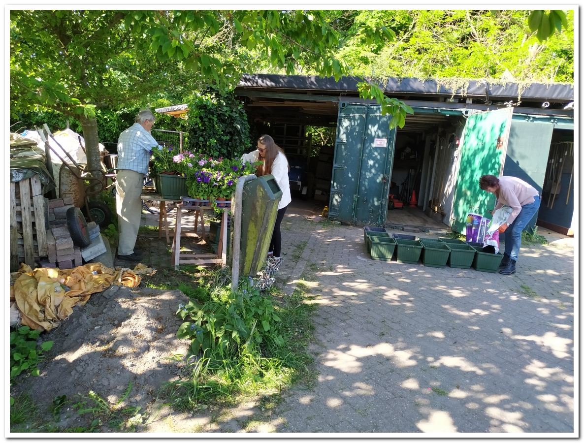 Hier nog even het vullen van de bakken met aarde en daarna de plantjes erin. Dit was alles bij elkaar wel 1,5 uur werk met zo’n 11 personen, voor dat het de kar op kon.