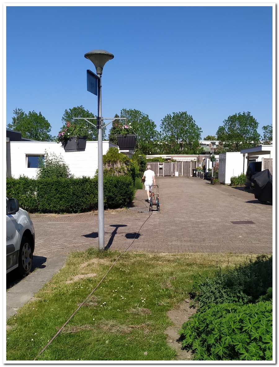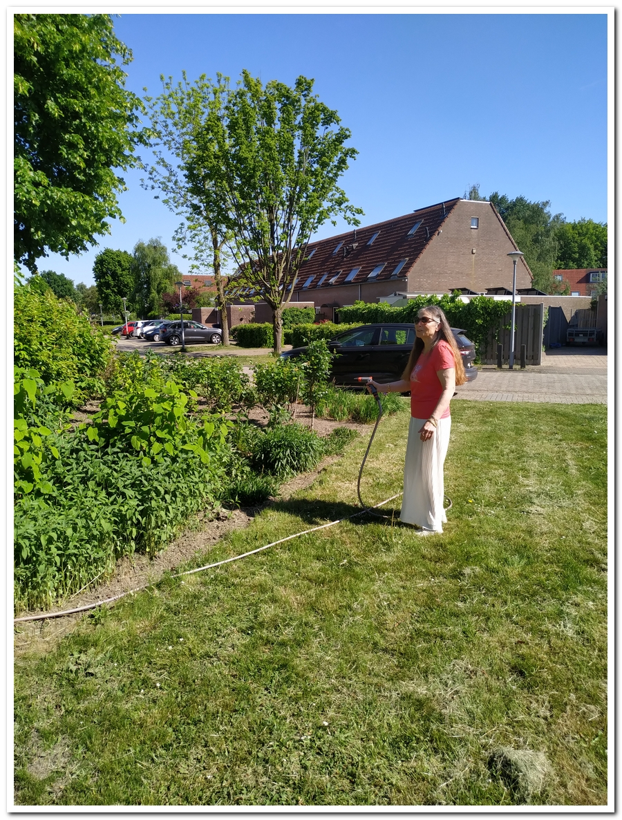 Door Henk eerst 50 meter waterslang uit rijen van huis naar de border op het centrale grasveld.