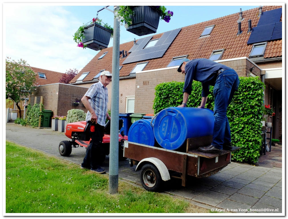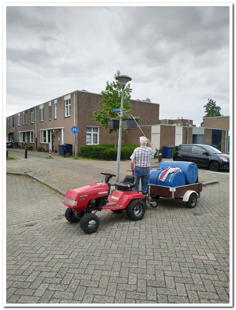 Na de laatste bakken opgehangen te hebben begon het al te regenen dus net op tijd klaar. Rob was ook voorbereid en zei, ik ga vast rijden om de bakken met water te vullen. Precies na de eerste bakken moest hij vluchten want er viel een plensbui en het bleef regenen met onweer.