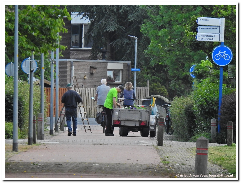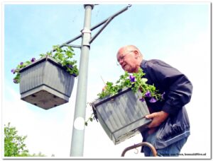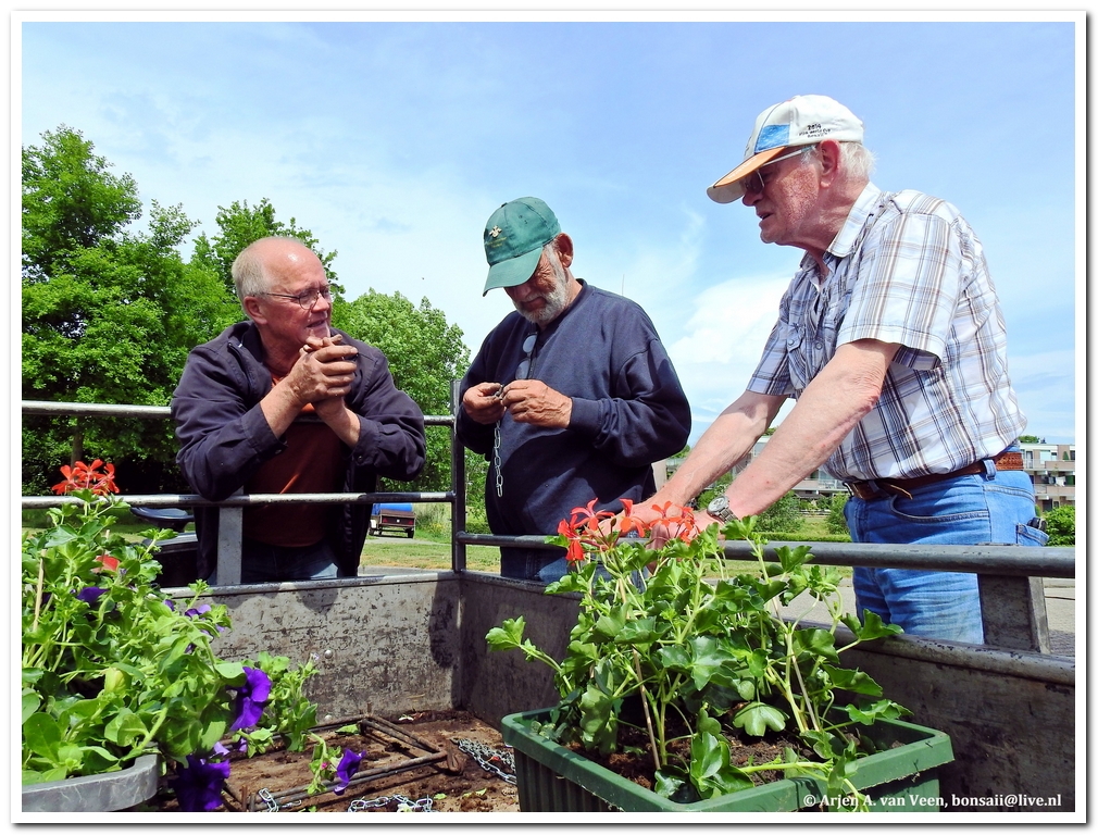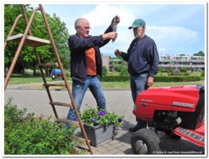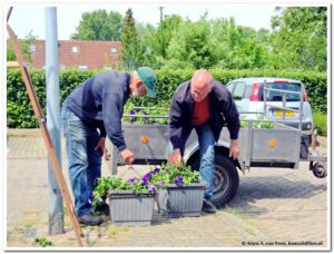 Gisterenavond heeft Fa. Laurens de bloemenkweker de nieuwe geraniums en petunia’s gebracht en begeleid door Willem en Rob. Zij hebben gelijk de bloembakken in de twee aanhangers gezet inclusief met grond gevuld. En dat voor 90 bakken.