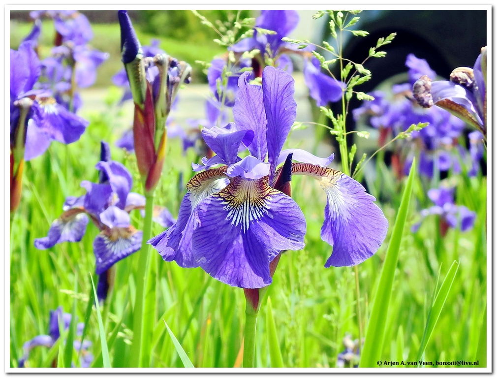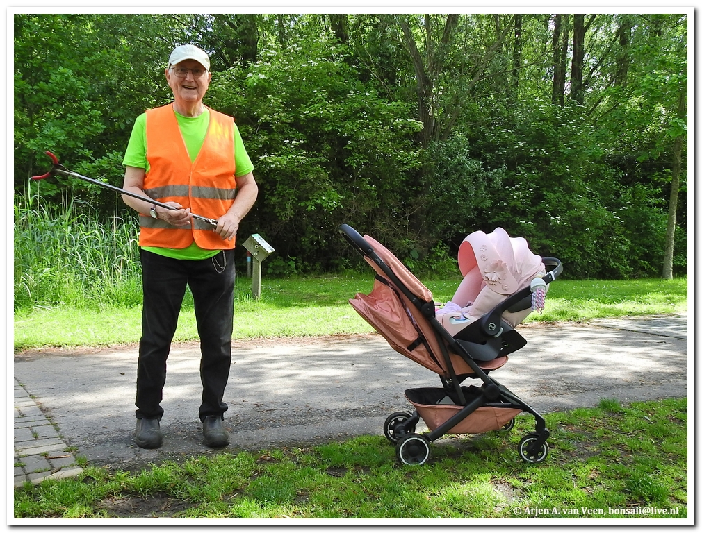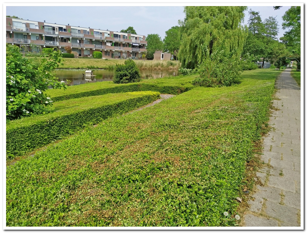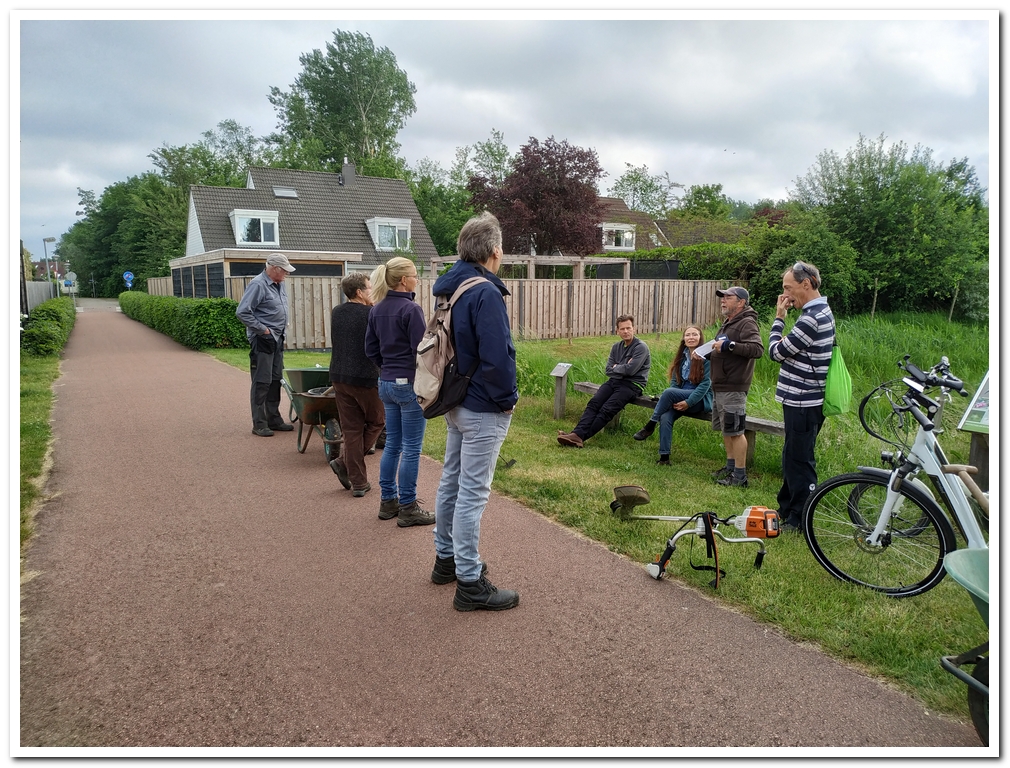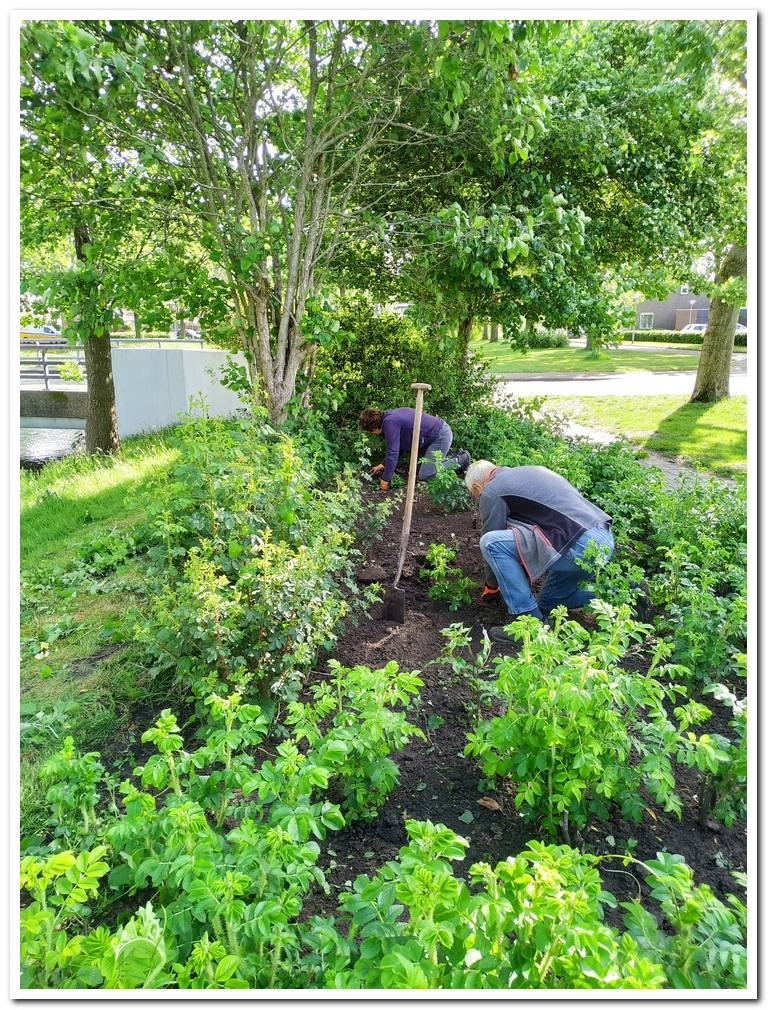 Bij de Hoekbrug waren Thom en Elly de borders aan het opknappen. Plantjes in en uitgraven, schoffelen en harken. Ziet er weer verzorgd uit.