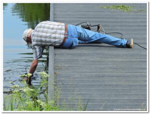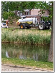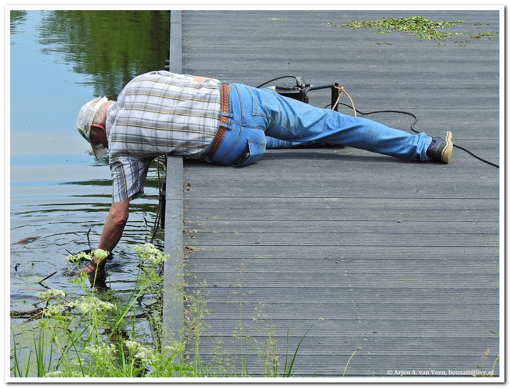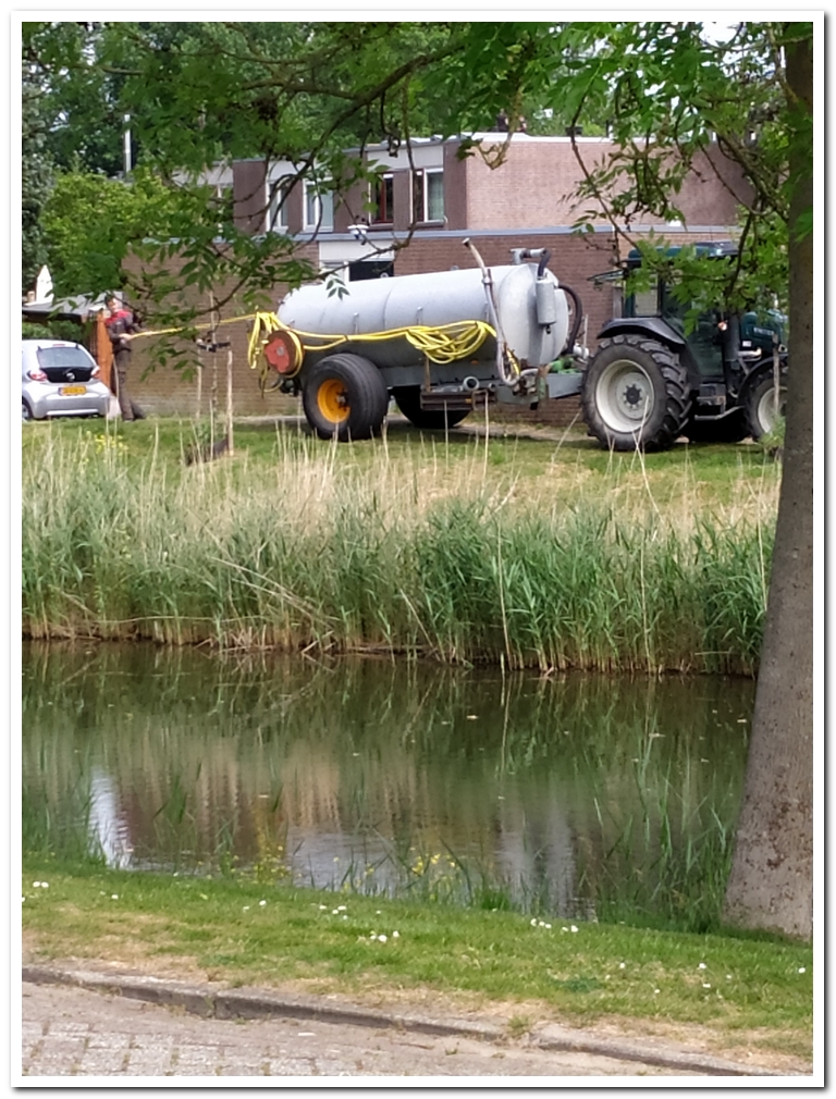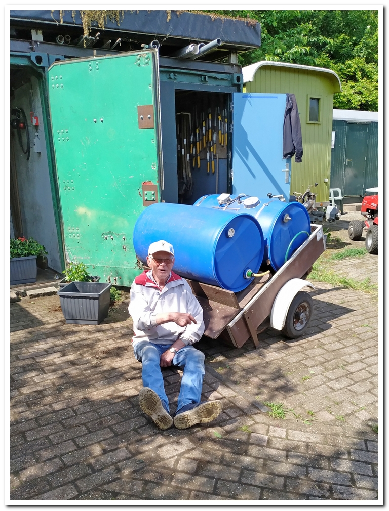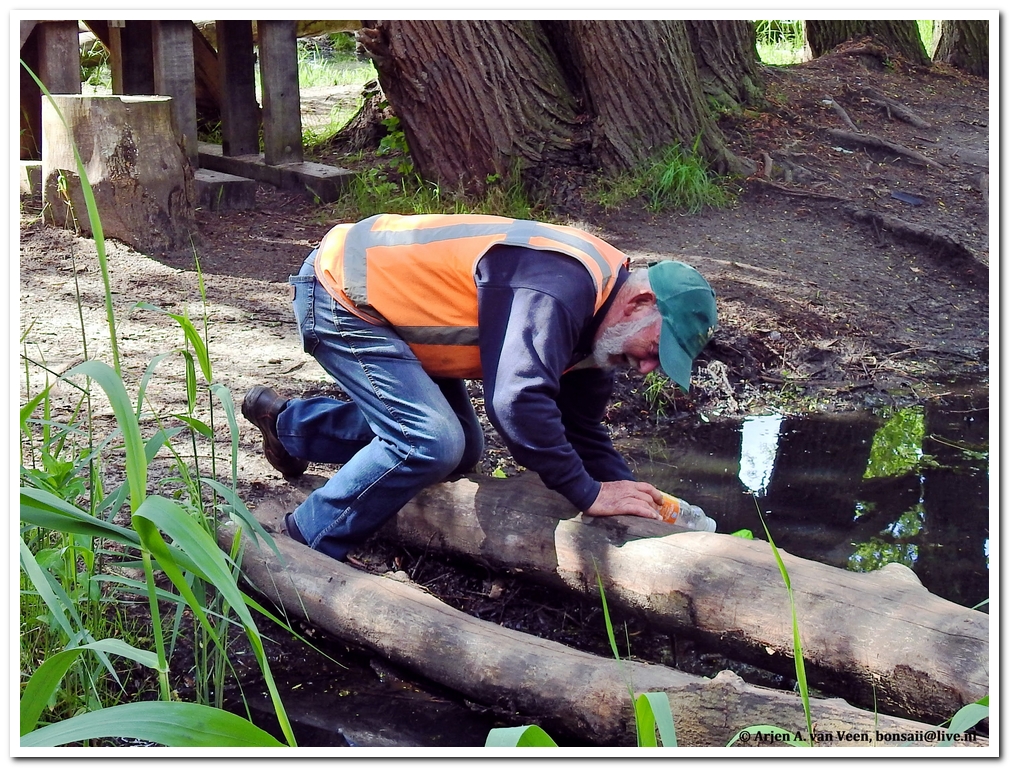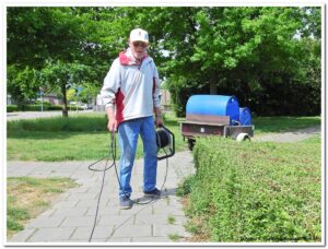 Hier is Rob bezig om de tonnen vast te vullen met water vanuit de gracht.