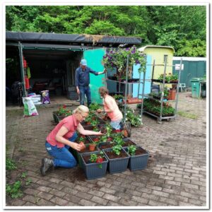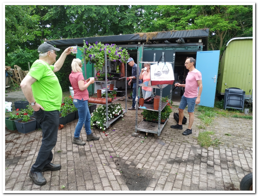 En hier zijn we al bezig de bakken te vullen met de plantjes. Aanwezig waren: Martin, Jos, Carol, Bram, Regien, Willem, Rob en Hans die deze klus moesten klaren. Tussendoor is de koffie verzorgd door Jos en Carol.