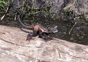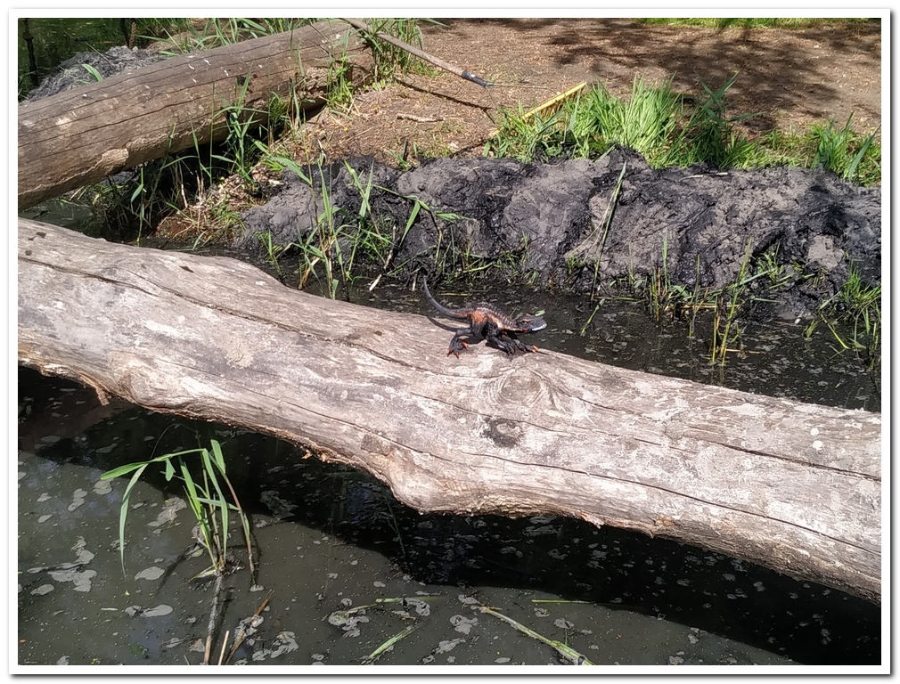 En wat een bijkomende ontdekking. Uit de modder kwam een echte, net uit het ei, een jonge Dino Spatiale Conditio. Hij liep parmantig over de balk rennend en blazend. Toch nog na een miljoen jaar uitgekomen. Als je langs “De Plek” komt zie je hem misschien.