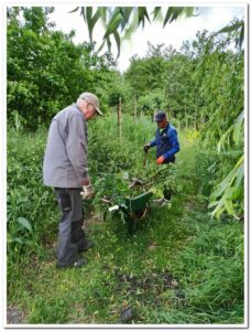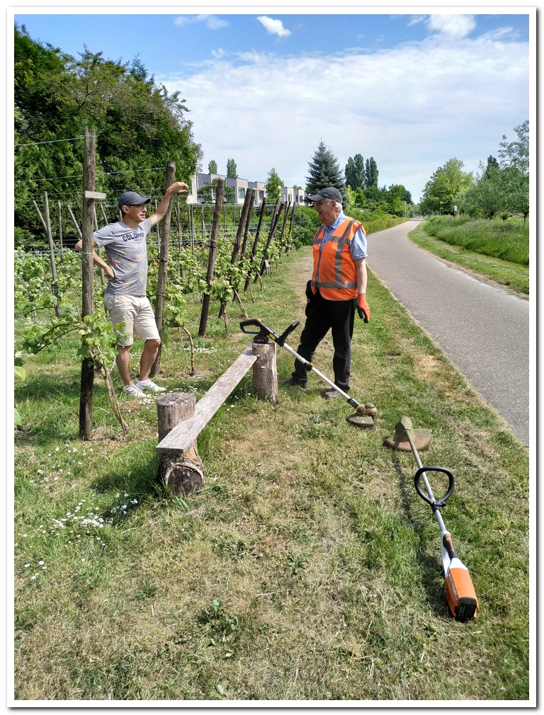 Tijdens het bosmaaien waar nodig was in de wijk, door Martin en Hans, stopte wij even bij Jos die bezig was de druiven takken te rangschikken en te binden.