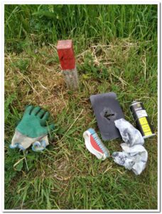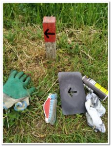Ik vond het toch weer nodig om de pijlen van ongeveer 12 wandelpalen opnieuw te voorzien van een duidelijke pijl, gedaan met een sjabloon en spuitverf.