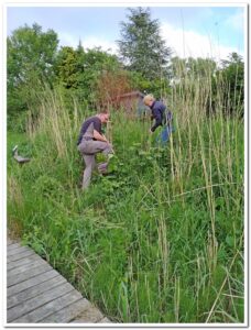 Carol en Menno graven de bramen weer uit in het talud nabij de brede vlonder aan de kwelbeek. Carol zei al dat ze dit nog geen 3 weken geleden hadden gedaan, zo snel groeien deze bramen.