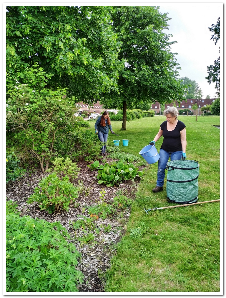 Ook de border van Henk en Yvonne wordt nu regelmatig mee genomen om geschoffeld te worden of andere werkzaamheden uit te voeren. Hier zie je dat Yvonne en Corinne bezig zijn met onkruid tussen de planten te verwijderen.