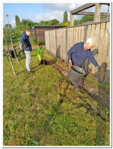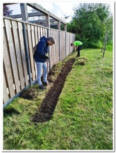 De volgende klus was een lange bloemenstrook maken achter de schutting van Lars. Hier begonnen Levien en Hester met plaggen steken.