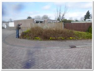 Wim schoffelt en knipt de Hoeksteen beplanting.