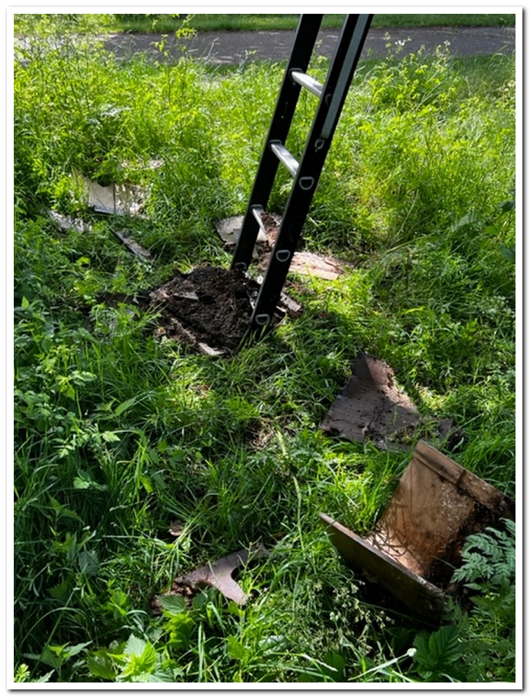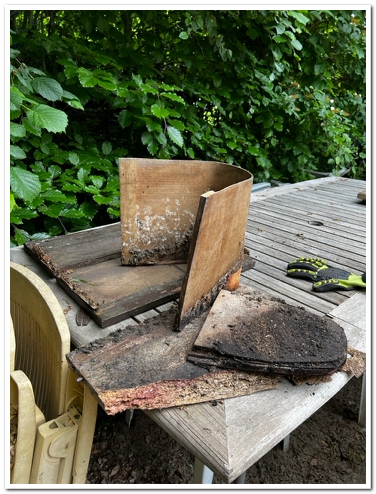 Je ziet wel hoe rot het is. Ze hebben besloten weer een mooie en stevige uilenkast te gaan maken en op dezelfde plek op te hangen. En nu maar zien aan de brokstukken hoe de kast er uit gezien heeft, om tot het zelfde model te komen.