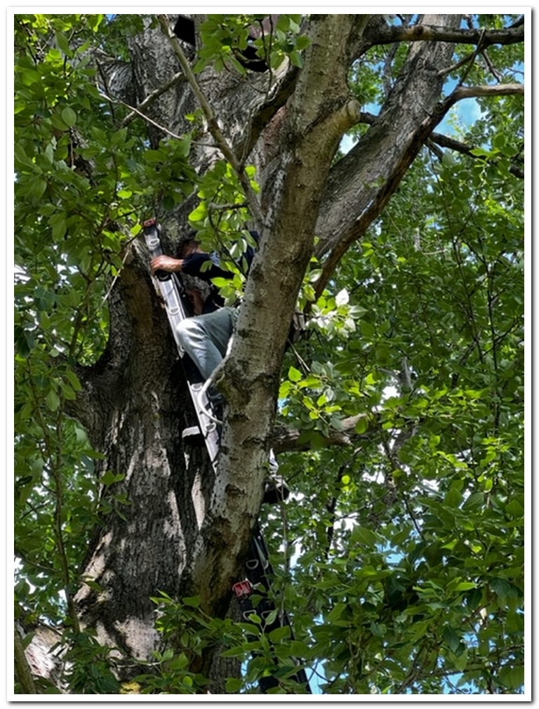 In de grote boom aan het het Veldlaarpad aan het krachtbossie hangt een grote uilennestkast. Om deze te inspecteren is nogal lastig bij te komen en hangt ook hoog. Geen nood voor Ruud en Mike. Uiteindelijk boven te komen zagen ze al snel dat de kast bijna uit elkaar valt.