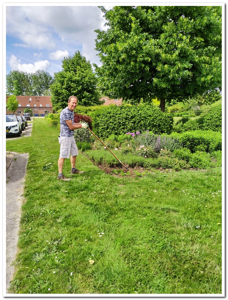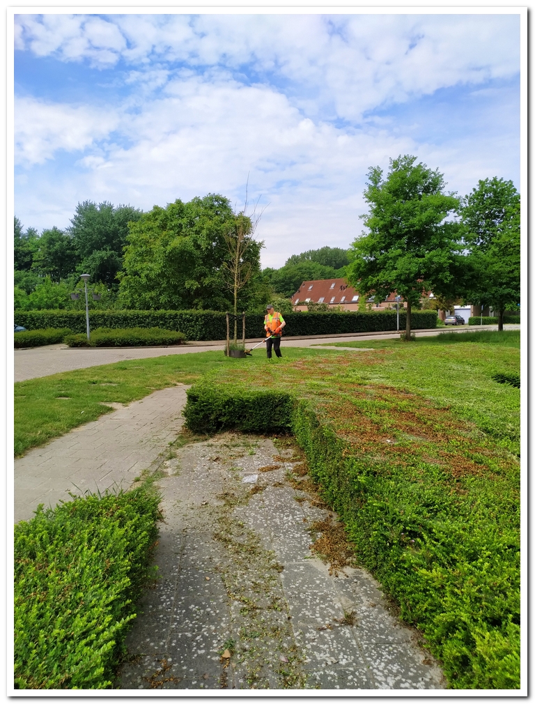 Ook de twee borders op de hoeken vrij geknipt van onkruid. En hier is Martin met zijn bosmaaier bezig de bestrating schoon te streamen.