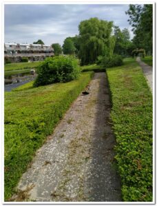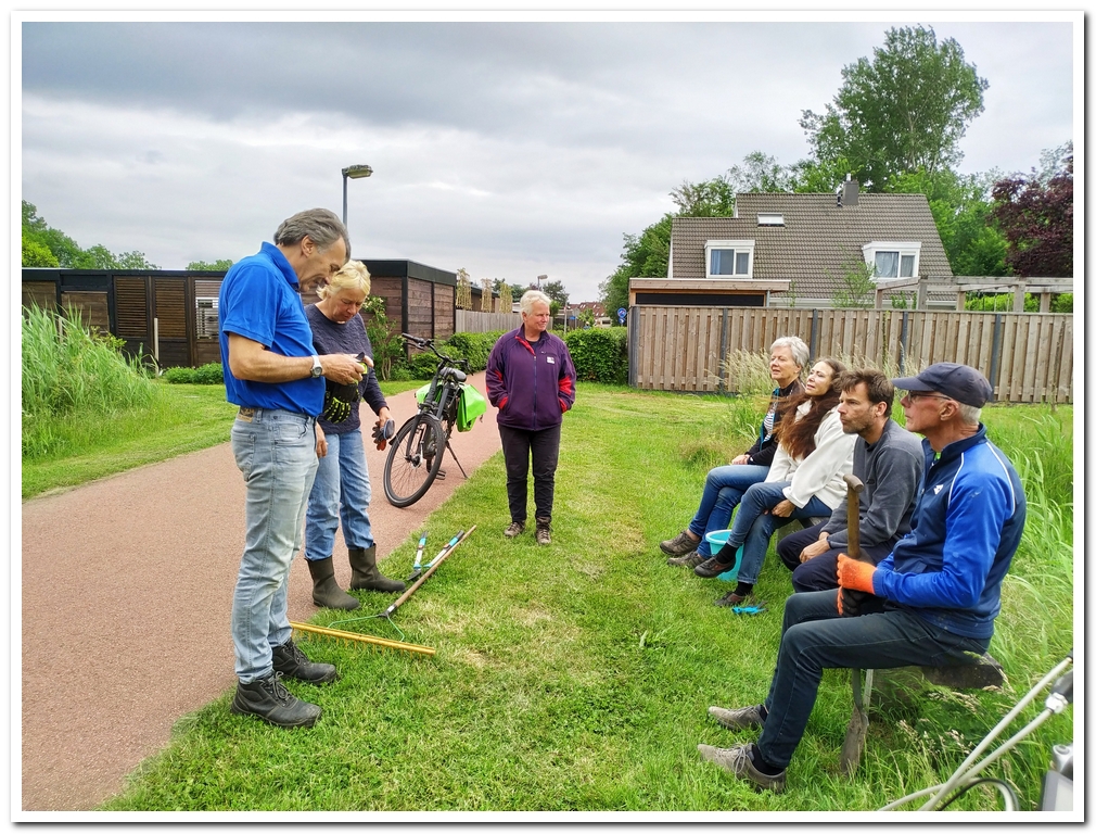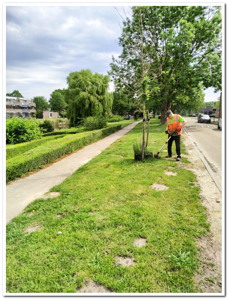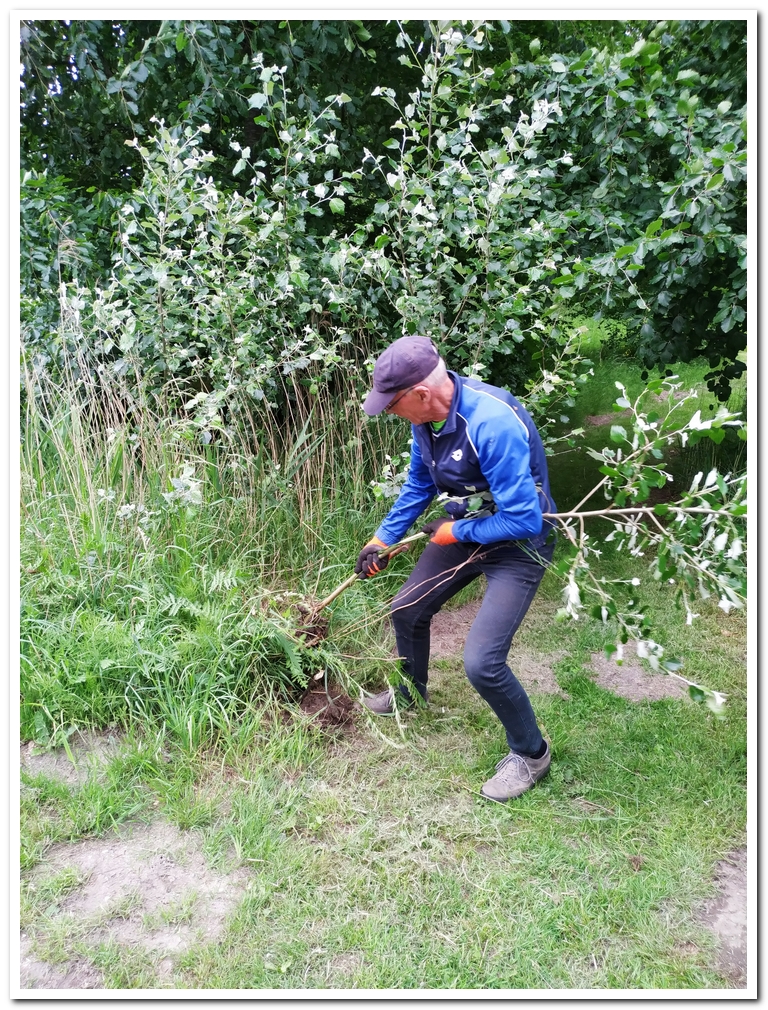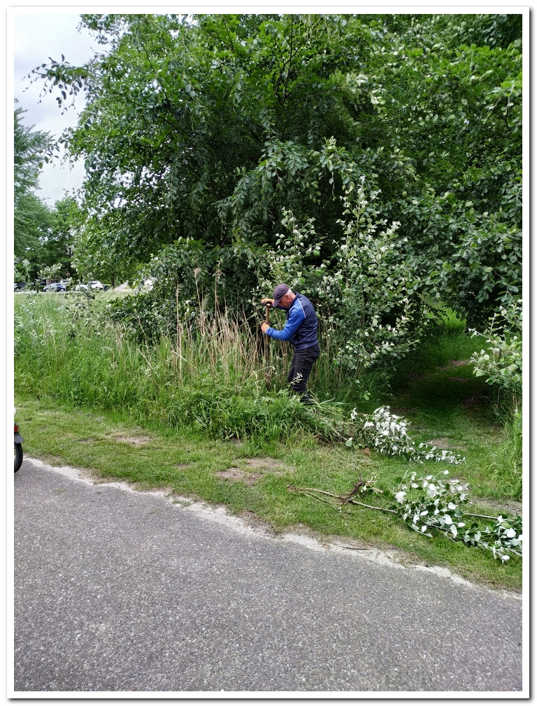 Wij- Martin en Hans– bosmaaien langs het grachttalud en rondom de steigerbeplanting en het onkruid op de paden en zo door naar de Hoekbrug.