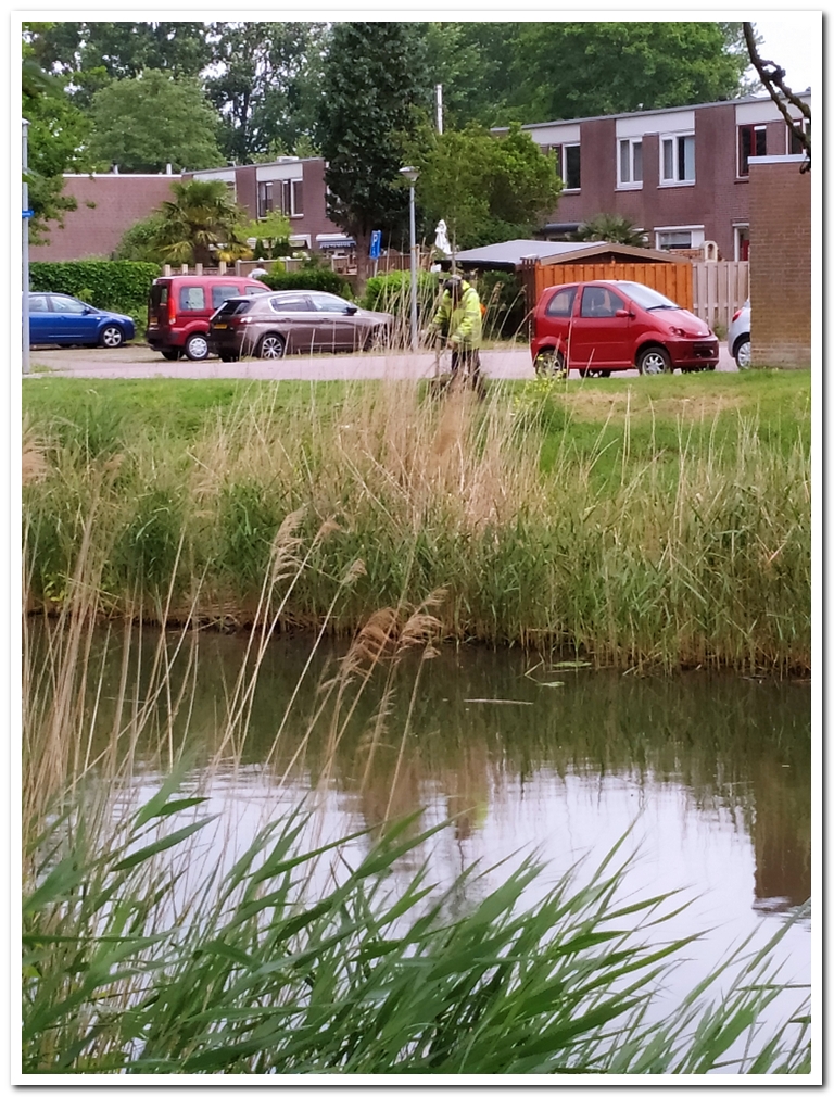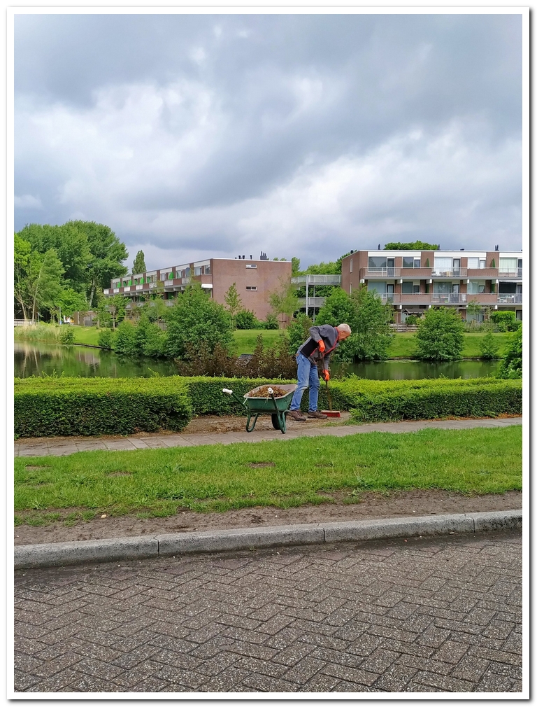 Later zag ik Ruud weer maar nu langs het fietspad naar de dijk om kleefkruid tussen de planten weg te trekken en op te ruimen. Je kan wel aan de gang blijven. Het zit overal in de struiken verstrikt.